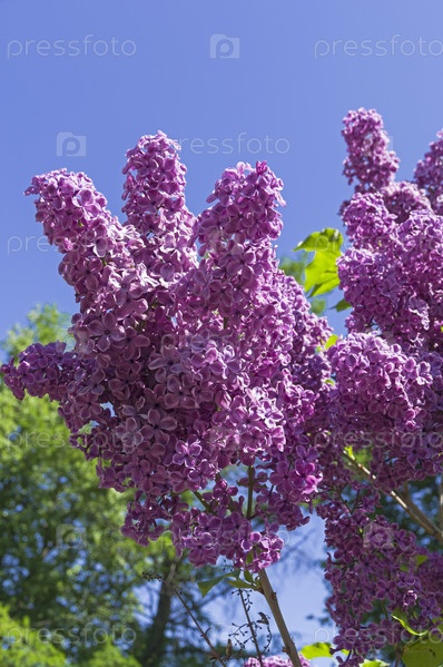 Цветущая сирень сорта "Сумерки" на фоне безоблачного неба. Ботанический сад Московского университета. Солнечный день в конце мая