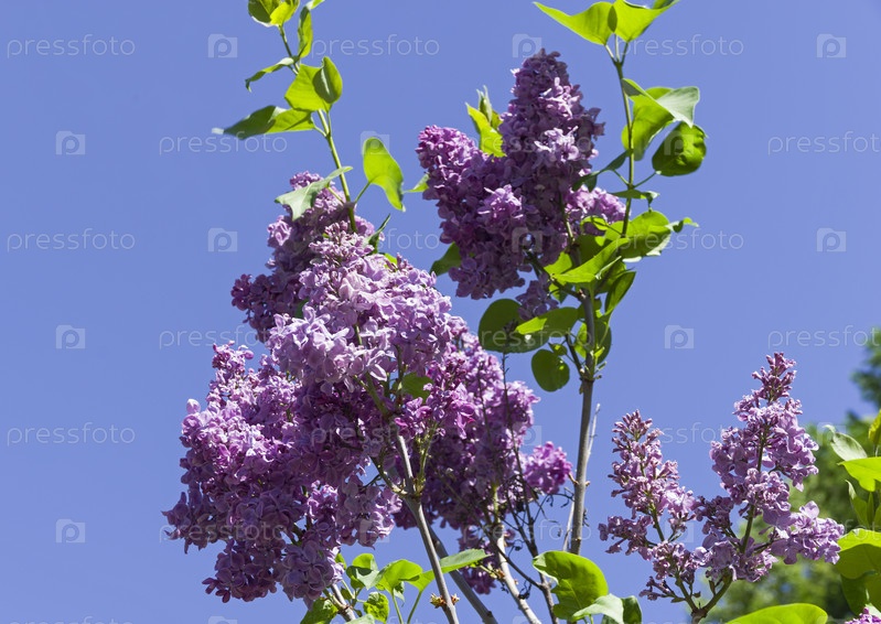 Цветущая сирень сорта "Поль Робсон" на фоне безоблачного неба. Ботанический сад Московского университета. Солнечный день в конце мая