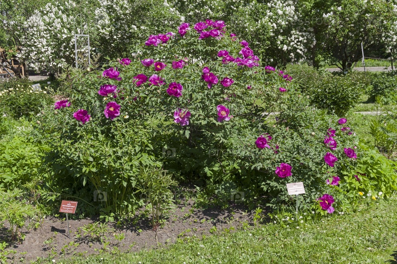 Цветущий древовидный (полукустарниковый) пион. Ботанический сад Московского университета. Солнечный день в конце мая
