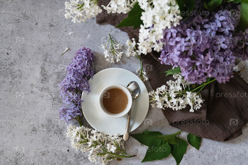 Открытка красивая. Необычная фиолетовая кофейная кружка, старая книга, соломенная шляпа и букет фиолетовой сирени. Красивый натюрморт. Весеннее время. Концепция доброго утра