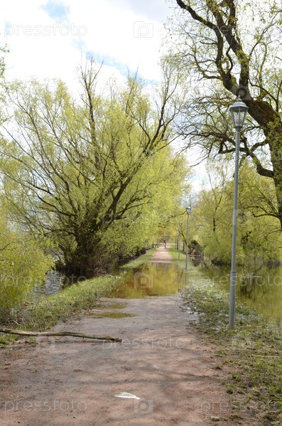 Затопленная весенним разливом Фотиева дорога в музее народного деревянного зодчества Витославлицы на берегу озера Мячино в Великом Новгороде