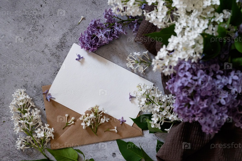 Композиция с пустым зеленым конвертом и красивыми весенними сиреневыми цветами на мятном фоне. Макет приглашения, поздравительная открытка, открытка, шаблон пространства для копирования. Ветви цветущего букета сирени