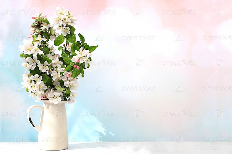 Красивые весенние цветущие ветви яблони в вазе на солнечном фоне, баннер. Абстрактная цветочная композиция, натюрморт с местом для текста, цветочная праздничная открытка, концепция летнего приветствия, выборочный фокус