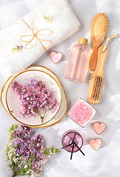 Спа и оздоровительная композиция с ароматной розовой водой, сиреневой водой и сиреневыми цветами, ароматерапия и уход за кожей, концепция образа жизни и органической косметики, приглашение и реклама салона, избирательный фокус