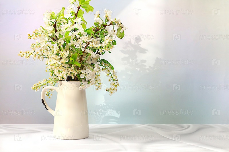Красивые весенние цветущие ветки яблони и черемухи в вазе на элегантном фоне, баннер. Абстрактная цветочная композиция, натюрморт с местом для текста, цветочная праздничная открытка, концепция летнего приветствия, выборочный фокус