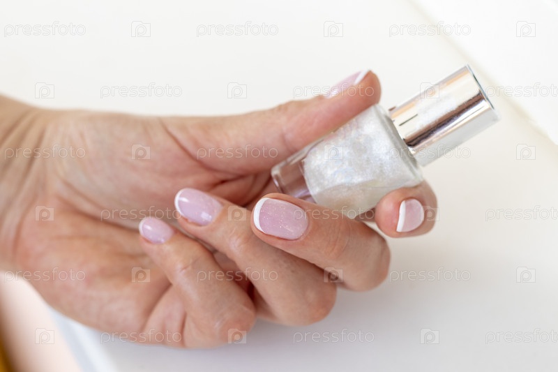Снимок руки красивой женщины, держащей бутылку эмали для ногтей. Мода