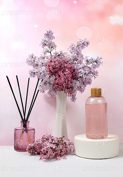 Ароматная розовая вода, сиреневые ароматические палочки и цветы сирени. Спа и оздоровительная композиция, приглашение и реклама салона, ароматерапия и уход за кожей, концепция образа жизни и органической косметики, избирательный фокус
