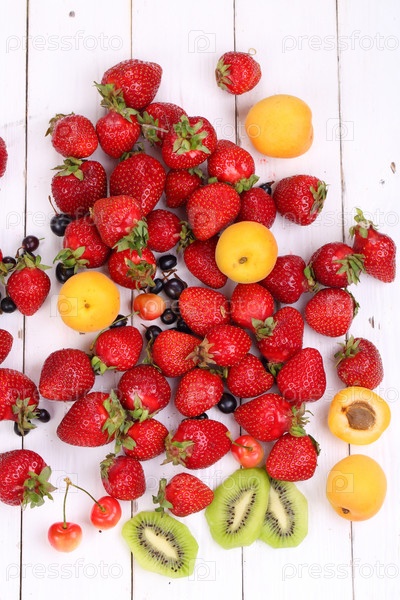 Ассорти из свежих ягод и фруктов на белом столе