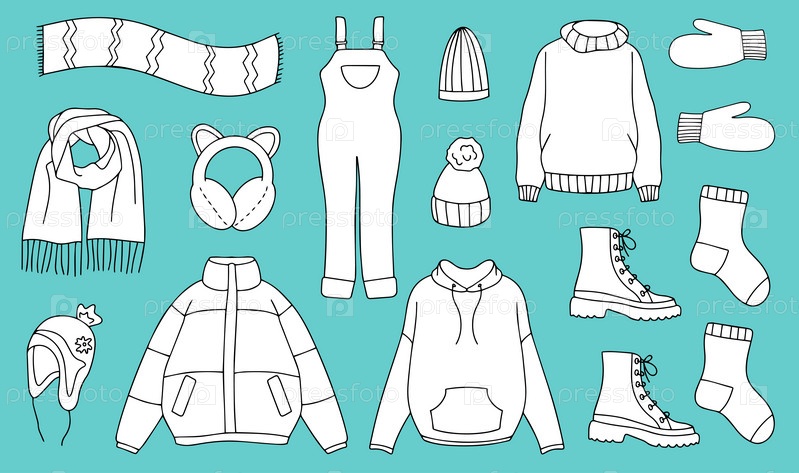 Теплая осенне-зимняя одежда. Векторная коллекция осенне-зимней одежды. Иконка векторного эскиза выделена синим цветом. Сезонные элементы дизайна. Вектор