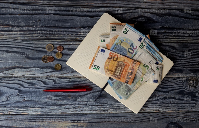 Деловой натюрморт с купюрами евро, монетами, ручкой и блокнотом