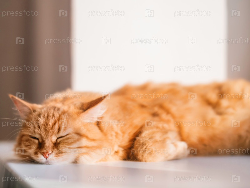 Милый рыжий кот спит на подоконнике. Пушистый питомец дремлет на солнечном свете. Уютный дом. Комфорт и спокойствие