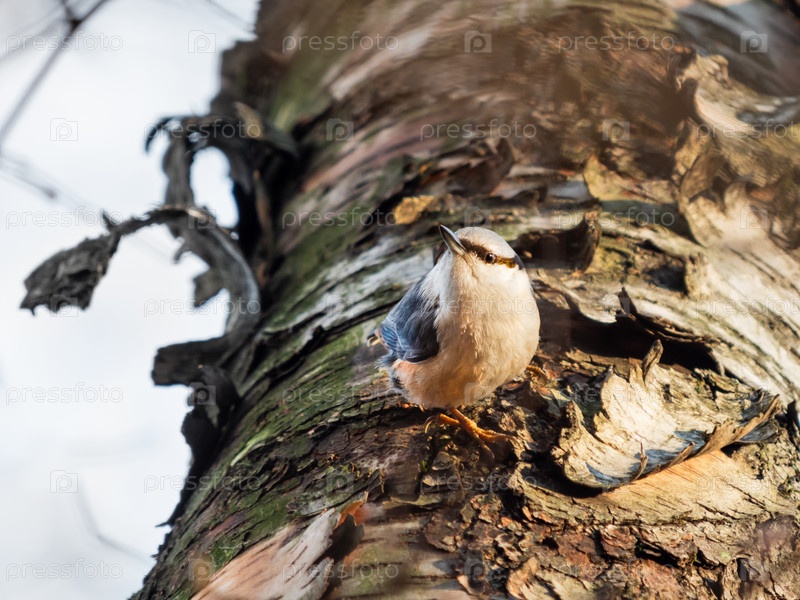 Евразийский ползучий или лесный ползучий. Sitta europaea, маленькая воробьиная птица на дереве. Зимний сезон