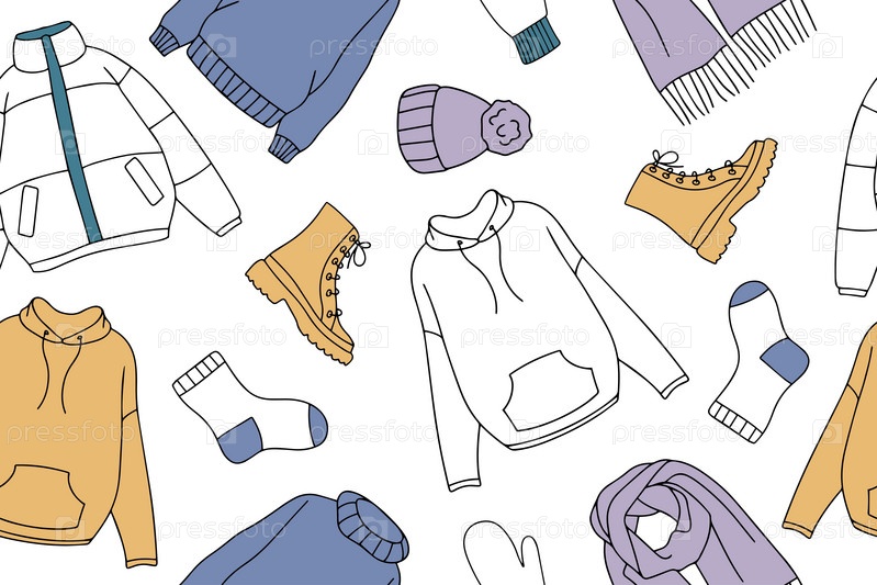 Теплая осенняя и зимняя одежда бесшовный узор в стиле каракулей. Векторная коллекция теплой, уютной одежды и обуви. Сезонная одежда бесшовный фон. Векторная иллюстрация