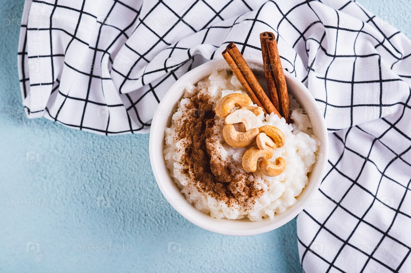 Крупный план рисового пудинга с корицей и кешью в миске на столе