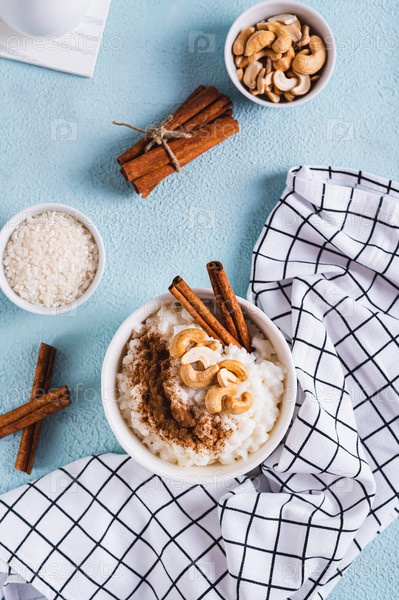 Чаша с вкусным рисовым пудингом с корицей и орехами на столе и вертикальный вид