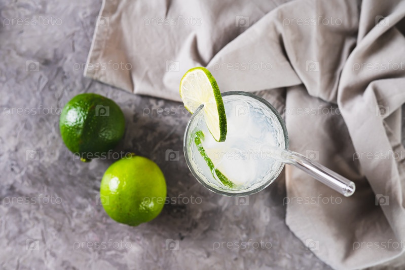 Крупным планом освежающий летний коктейль мохито со льдом и лаймом в стакане на столе