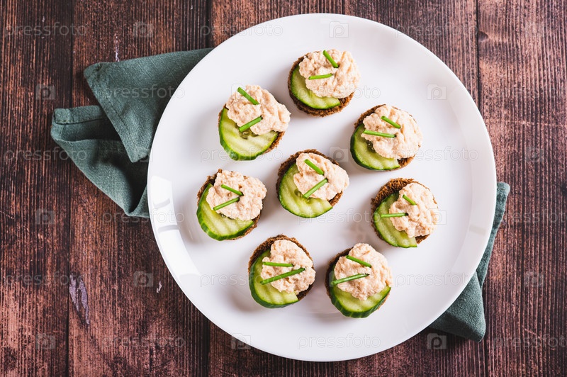 Крупным планом вкусные бутерброды на ржаном хлебе с огурцом, икрой мойвы и луком, вид сверху