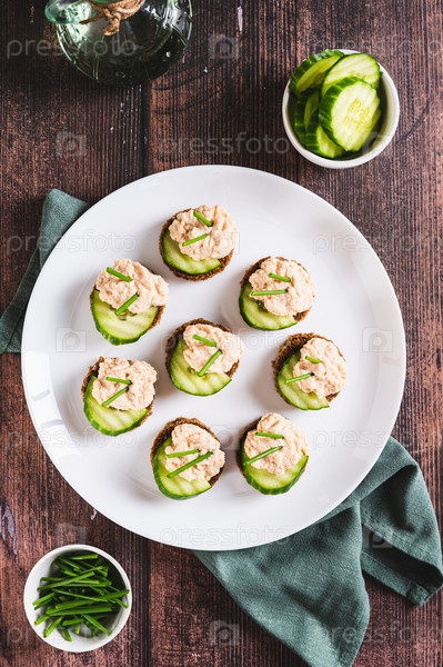 Аппетитные бутерброды с икрой минтая, огурцом и зеленью на тарелке и вертикальный вид