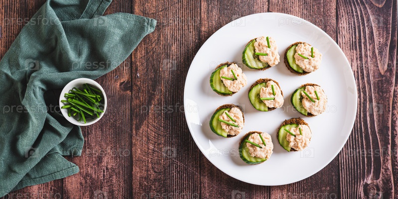 Аппетитные бутерброды с икрой минтая, огурцом и зеленью на тарелке, вид сверху, веб-баннер