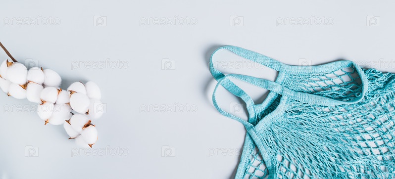 Концепция отказа от пластиковых пакетов. Авоська и хлопковая ветка на синем фоне веб-баннера
