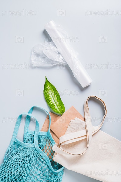 Текстильные, хлопковые и бумажные пакеты в сравнении с пластиковыми пакетами, вид сверху и вертикально