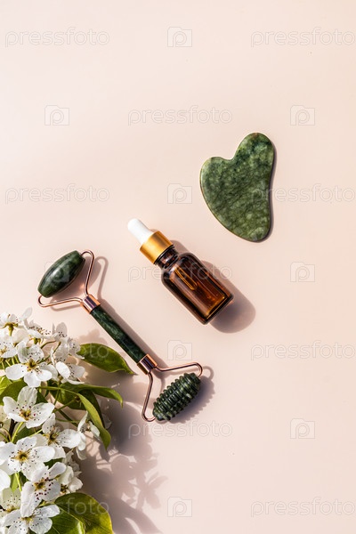 Набор косметического массажера из натурального нефрита и скребка гуа-ша, масла для лимфодренажного массажа на бежевом вертикальном фоне. ветки цветущие