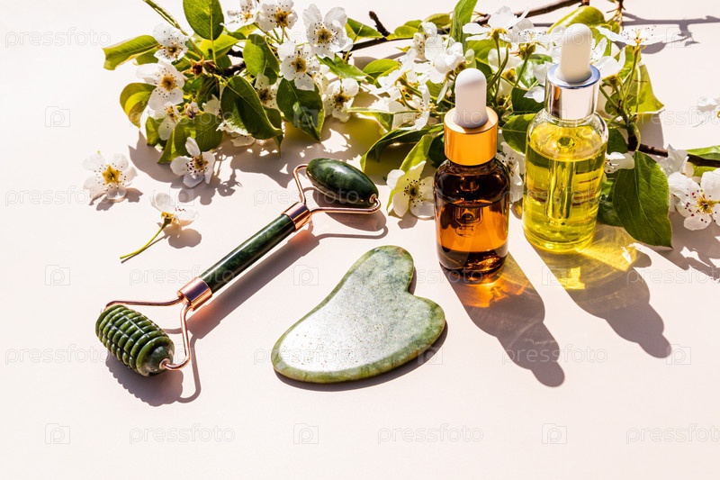 Роликовый массажер из зеленого натурального нефрита, гуаша, косметическое массажное масло во флаконе для домашнего массажа лица. цветущие ветви фруктового дерева