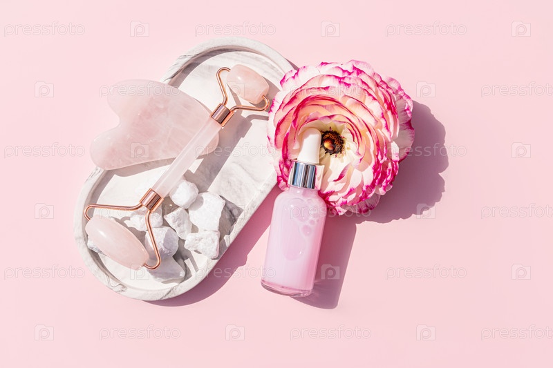 Роликовый массажер из розового кварца, скребок Гуа Ша, открытая бутылка с капельницей массажного масла или сыворотка для ухода за лицом на керамическом подносе. Вид сверху