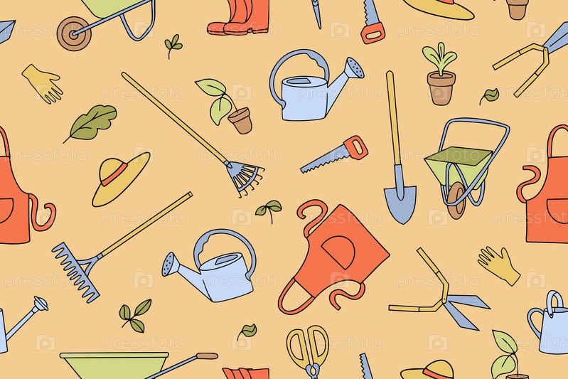 Бесшовный рисунок садовых инструментов в стиле каракулей. Лейка, мотыга, ведро, шланг, вилы, лопата, тачка, мастерок, секатор, саженцы деревьев, садовая вилка, грабли и другие линейные значки. Векторная иллюстрация