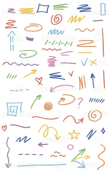 Штрихи своими руками маркером и карандашом. Маркерные линии, карандашные полосы, элементы выделения, иллюстрации перманентных маркеров в виде галочек, сердечек, стрелок в разных направлениях. Привлекательные визуальные эффекты для графического дизайна, ху