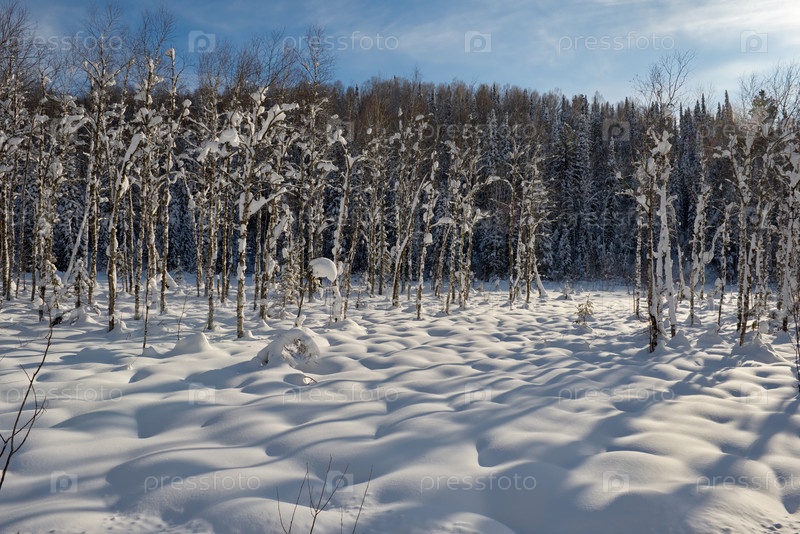 Россия. Кузнецкий Алатау. Снежные сугробы перспективе вдоль зимней таежной дороги