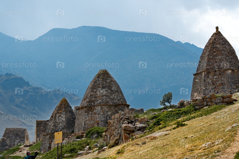 Россия. Северный Кавказ, Кабардино-Балкария. живописная панорама каменных склеп в Городе Мертвых XI века возле села Эльтюбю в Чегемском ущелье