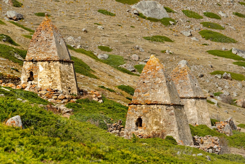 Россия. Северный Кавказ, Кабардино-Балкария. живописная панорама каменных склеп в Городе Мертвых XI века возле села Эльтюбю в Чегемском ущелье