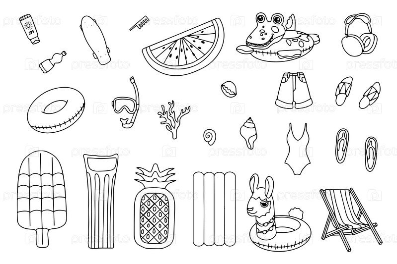Ручной набор элементов летнего отдыха, купальников и пляжных аксессуаров. Элемент путешествия, нарисованный в стиле каракулей. Иллюстрация для баннера, фона, значка, дизайна логотипа. Вектор