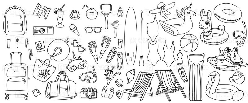 Ручной набор элементов летнего отдыха, багажа, купальников и пляжных аксессуаров. Элемент путешествия, нарисованный в стиле каракулей. Иллюстрация для баннера, фона, значка, дизайна логотипа. Вектор