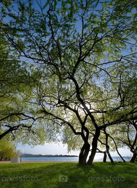 Кыргызстан. Контрастное утреннее солнце над берегом озера Иссык-Куль сквозь зеленые кроны ив