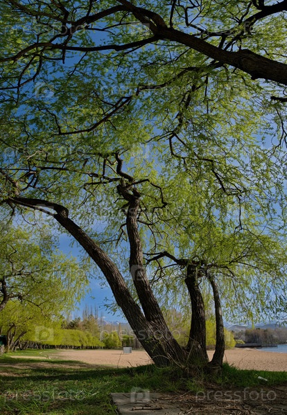 Кыргызстан. Контрастное утреннее солнце над берегом озера Иссык-Куль сквозь зеленые кроны ив