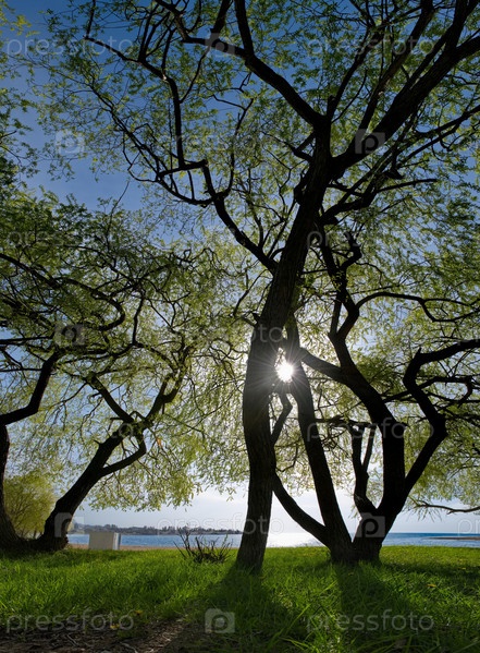 Кыргызстан. Контрастное утреннее солнце над берегом озера Иссык-Куль сквозь зеленые кроны ив