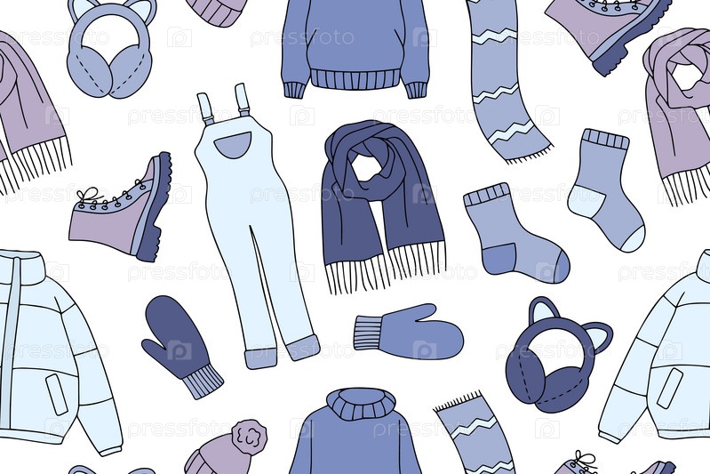 Теплая осенняя и зимняя одежда бесшовный узор в стиле каракулей. Векторная коллекция теплой, уютной одежды и обуви. Сезонная одежда бесшовный фон. Векторная иллюстрация