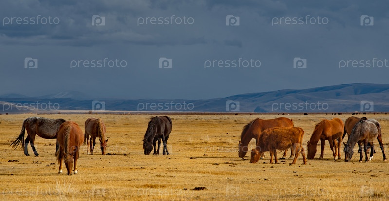 Россия. Юг Западной Сибири, Горный Алтай. Небольшое стадо лошадей мирно пасется в степи на фоне облачного темного неба на закате