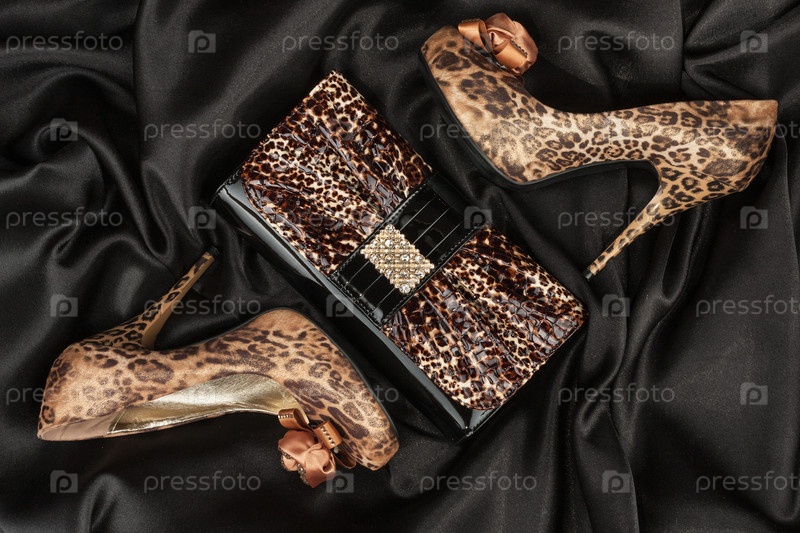 Леопардовая лаковая сумка и леопардовые туфли на черном фоне