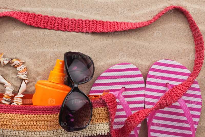 Пляжные аксессуары. Сумка, солнцезащитные очки и шлепанцы. С местом для вашего текста