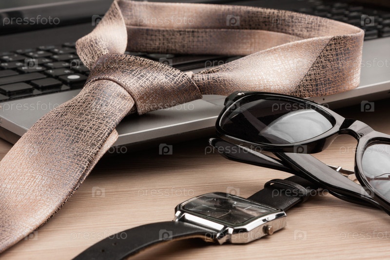 Мода и бизнес, ноутбук, часы, галстук на деревянном столе в качестве фона