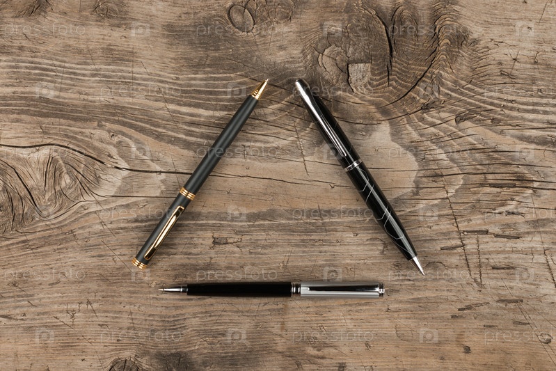 Черные, золотые и серебряные ручки на деревянной текстуре