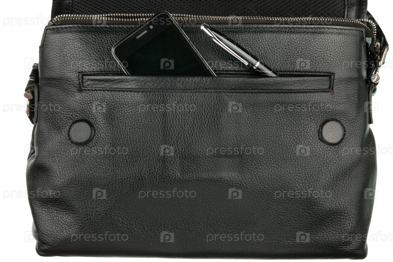 Телефон и ручка торчат из его карманного черного кожаного портфеля