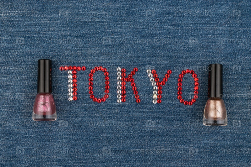 Слово Токио, выполненное из страз, инкрустировано на джинсовой ткани. Мировая мода