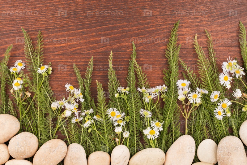 Полевые цветы, растущие из белых камней на темном деревянном фоне