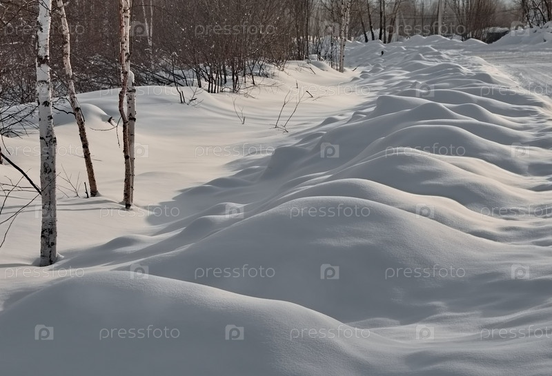 Россия. Кузнецкий Алатау. Снежные сугробы перспективе вдоль зимней таежной дороги