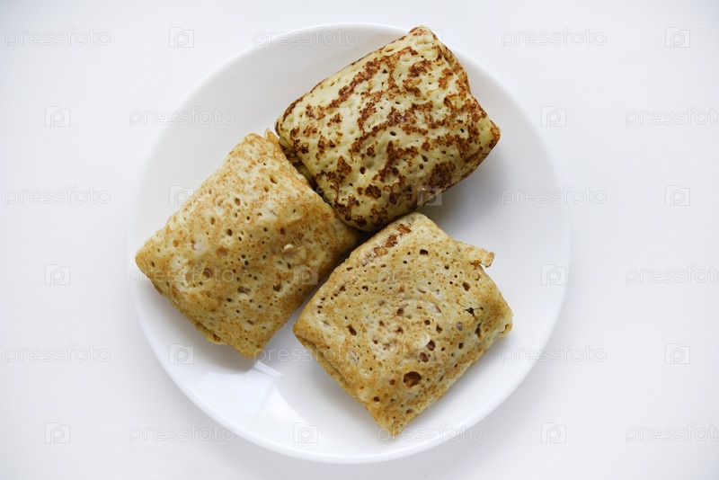 Блинчики с мясом на белой тарелке. Вкусный завтрак с мясной начинкой