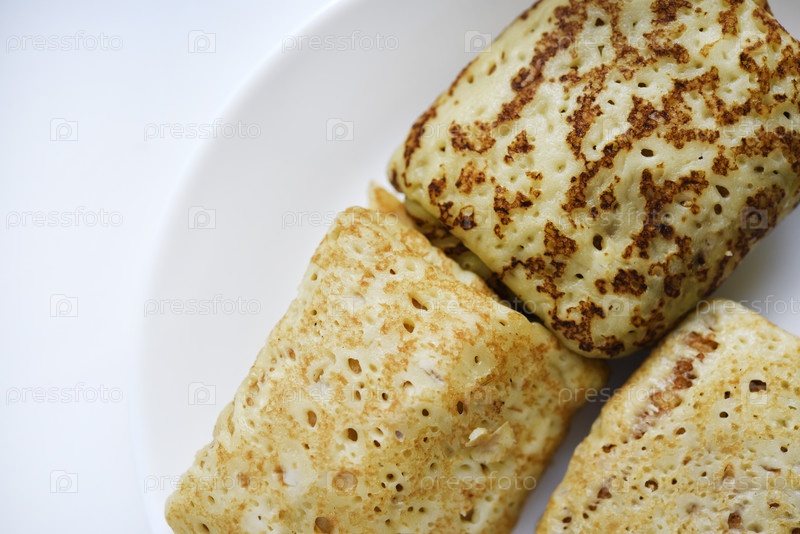 Блинчики с мясом на белой тарелке. Вкусный завтрак с мясной начинкой